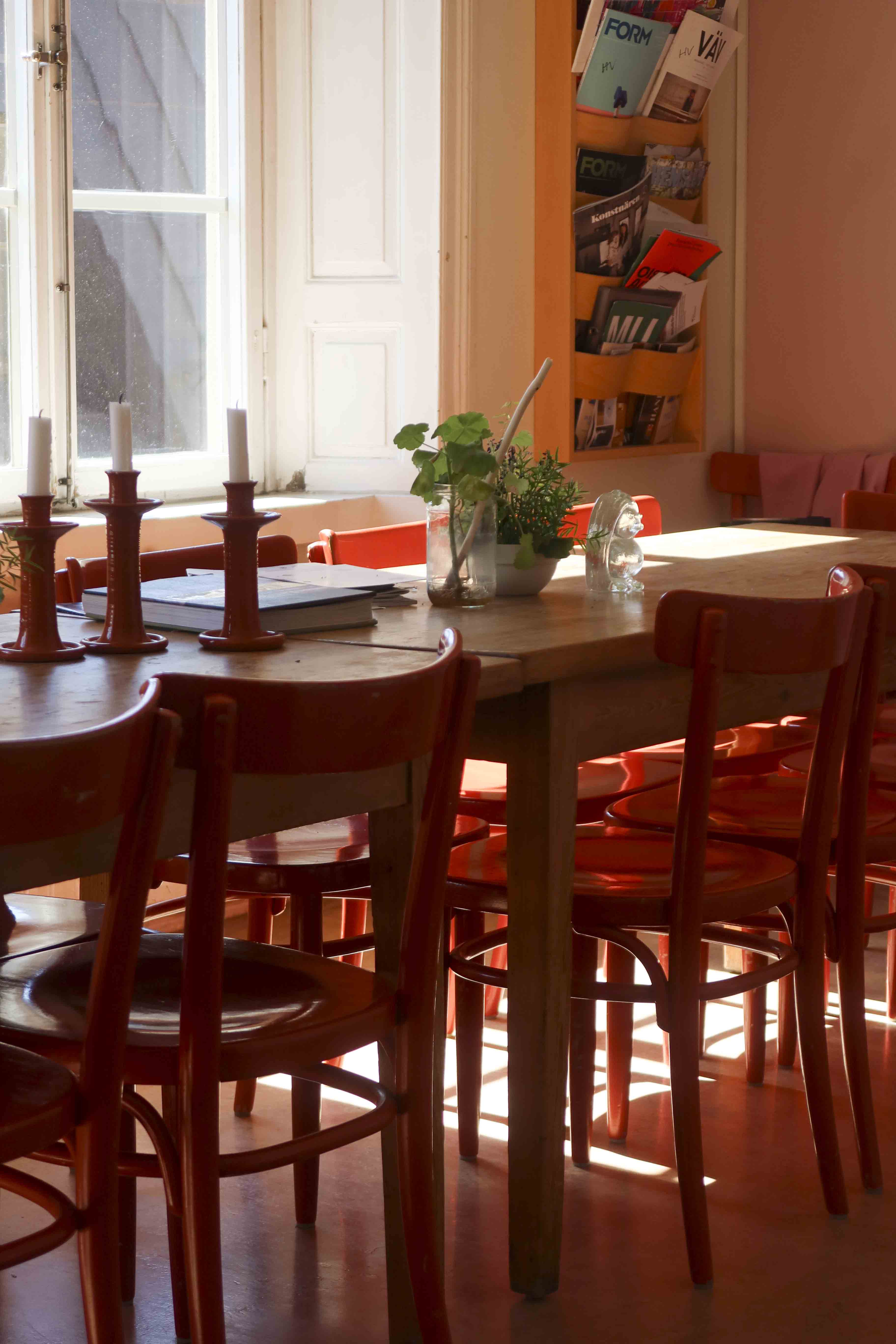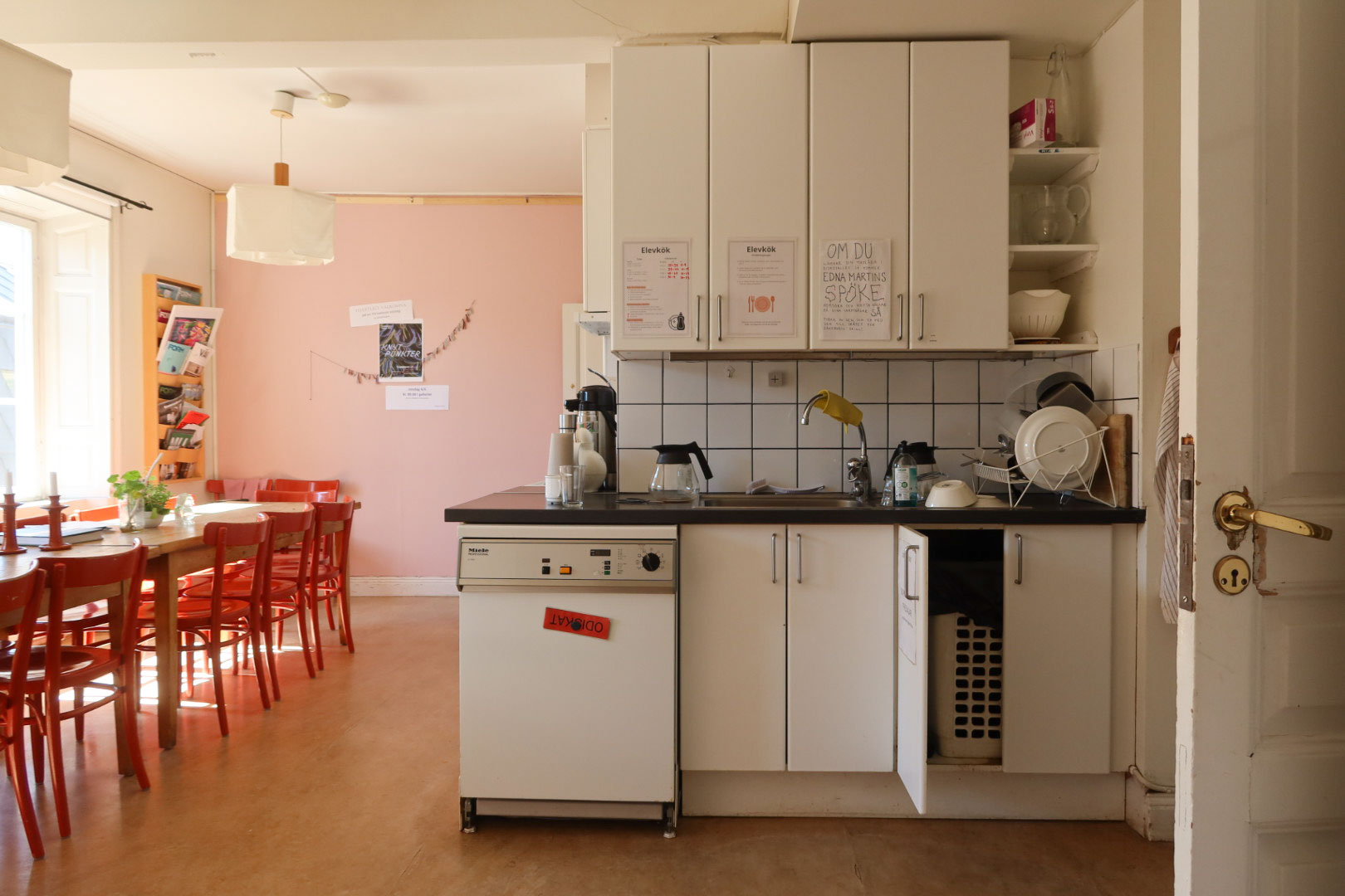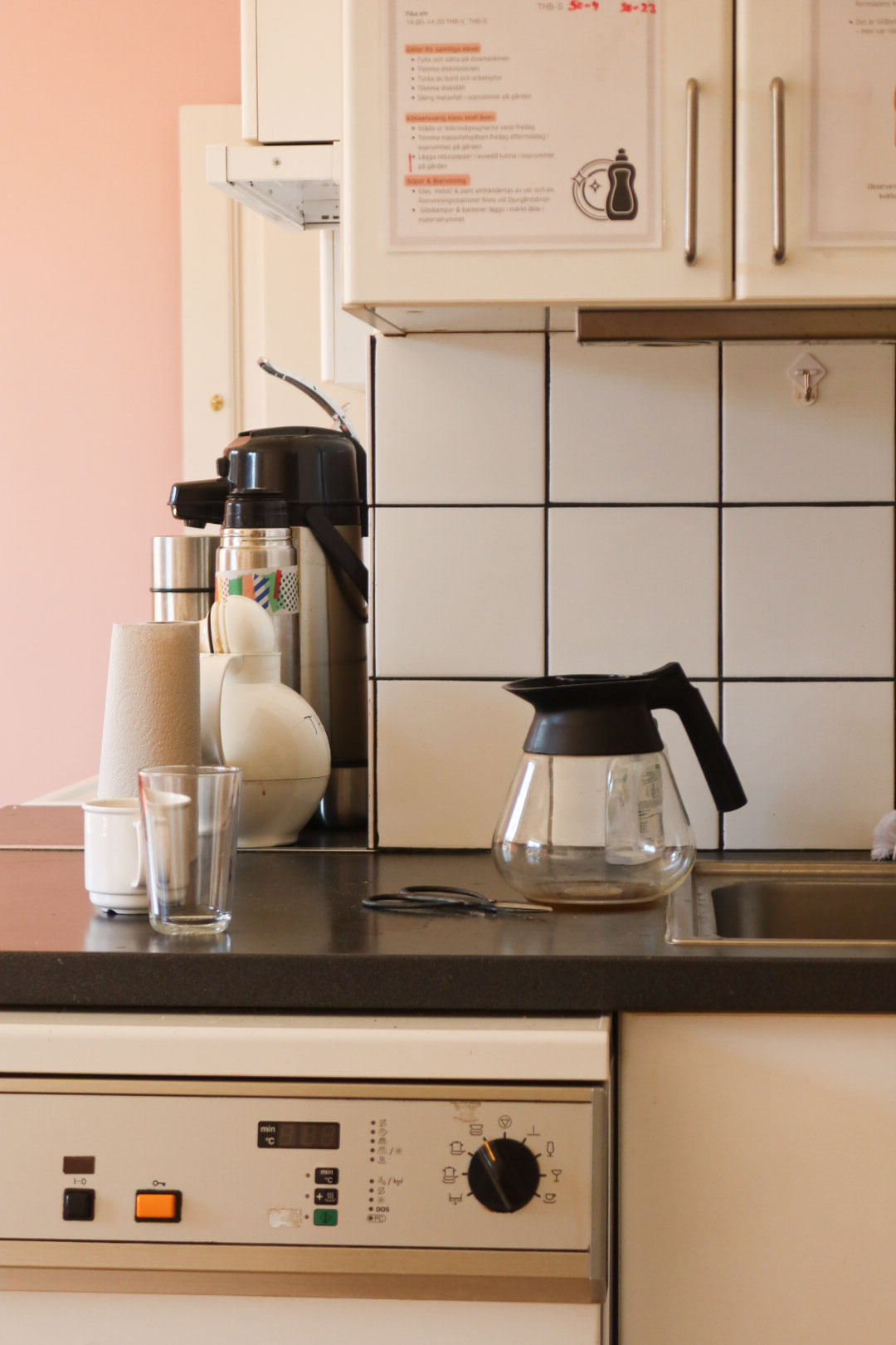 이 학교 안에는 지극히 평범하지만 여러 세월이 담긴 물건들이 있다. 예를 들면 노르스름한 흰색을 띠는 부엌 상부장과 하부장, 성실하게 이어 붙인 타일, 그리고 아주 오래된 모델의 식기 세척기가 있다. 그 옆으로는 빛바랜 색이 담긴 책상과 짙은 감귤색 의자가 나란히 있다. 수업을 마친 학생들의 피카(Fika: 커피와 함께하는 휴식 시간)를 위한 장소라고 한다. 책상 위로 올려진 귀여운 촛대와 작은 식물들은 마치 그들이 둘러앉아 나누던 정다운 이야기의 자욱 같았다.