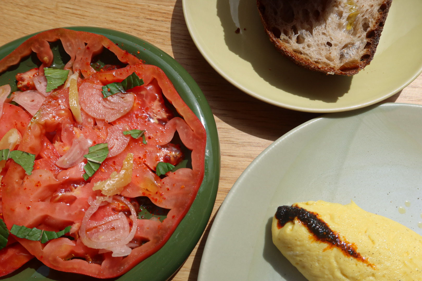살이 꽉 차오른 토마토 단면을 코끝에 가져다 댄다. 과하지 않은 드레싱 사이로 향긋한 냄새가 난다. '쿠오레 델 베수비오'(Cuore Del Vesuvio Tomato: 베수비오의 심장)라고 하는 이탈리아 품종의 토마토인데 내가 아는 토마토보다 물내가 적고 식감이 훨씬 아삭거렸다. 부드럽게 입안을 타고 도는 오믈렛에 특별한 맛을 선사하는 기분이다. 소금에 절인 레몬과 양파의 맛이 곁들여져 무척 맛있었다.